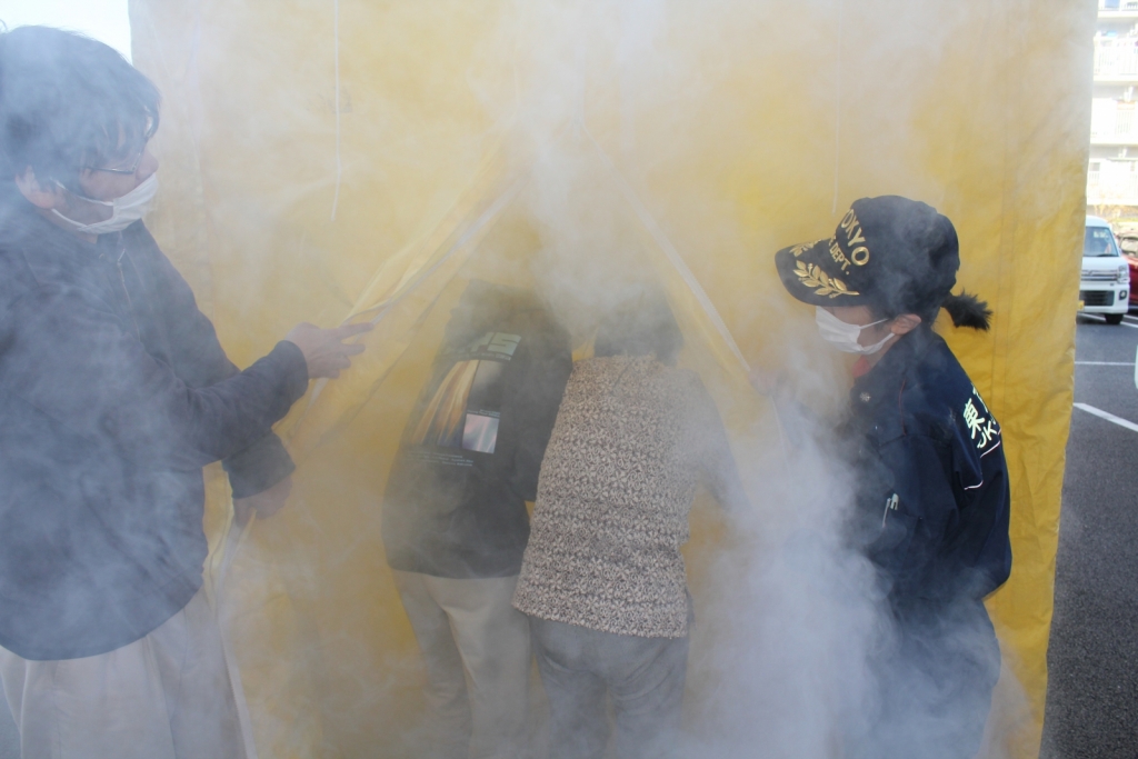 午後は駐車場に煙ハウスを設置し、ご利用者と職員で煙の中に入る体験をしました。また、水消火器を用いた消火訓練も実施しました。