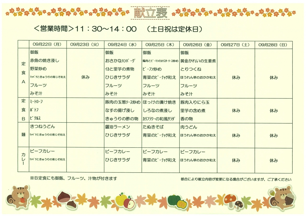 こぶしえん内レストラン 9月22日(月)~9月26日(金)のメニューです。