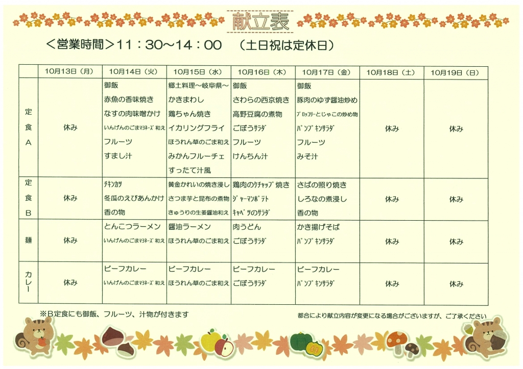 こぶしえん内レストラン 10月14日(火)~10月17日(金)のメニューです。