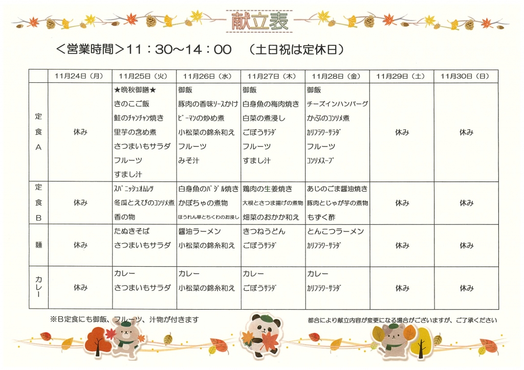 こぶしえん内レストラン 11月25日(火)~11月28日(金)のメニューです。