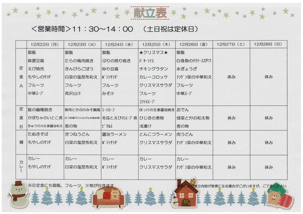 こぶしえん内レストラン 12月22日(月)~12月26日(金)のメニューです。