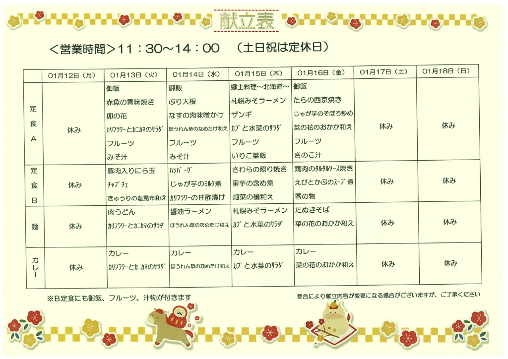こぶしえん内レストラン 1月13日(火)~1月16日(金)のメニューです。