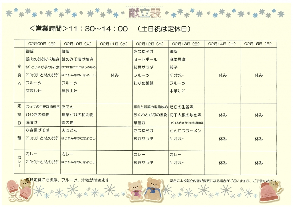 こぶしえん内レストラン 2月9日(月)~2月13日(金)のメニューです。