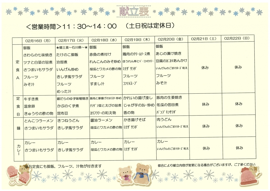 こぶしえん内レストラン 2月16日(月)~2月20日(金)のメニューです。