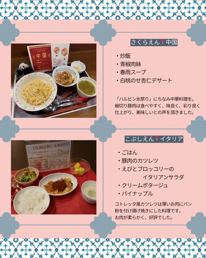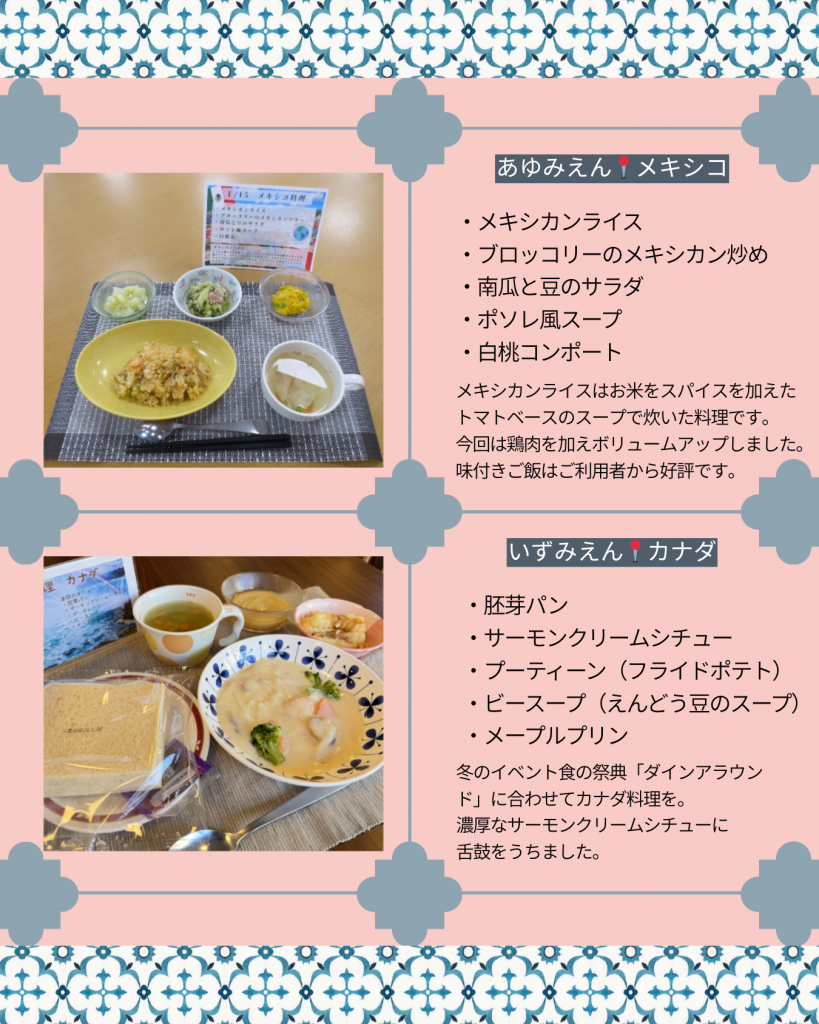 各施設がそれぞれテーマとなる国を選び、管理栄養士が工夫を凝らして現地の味を再現しました。