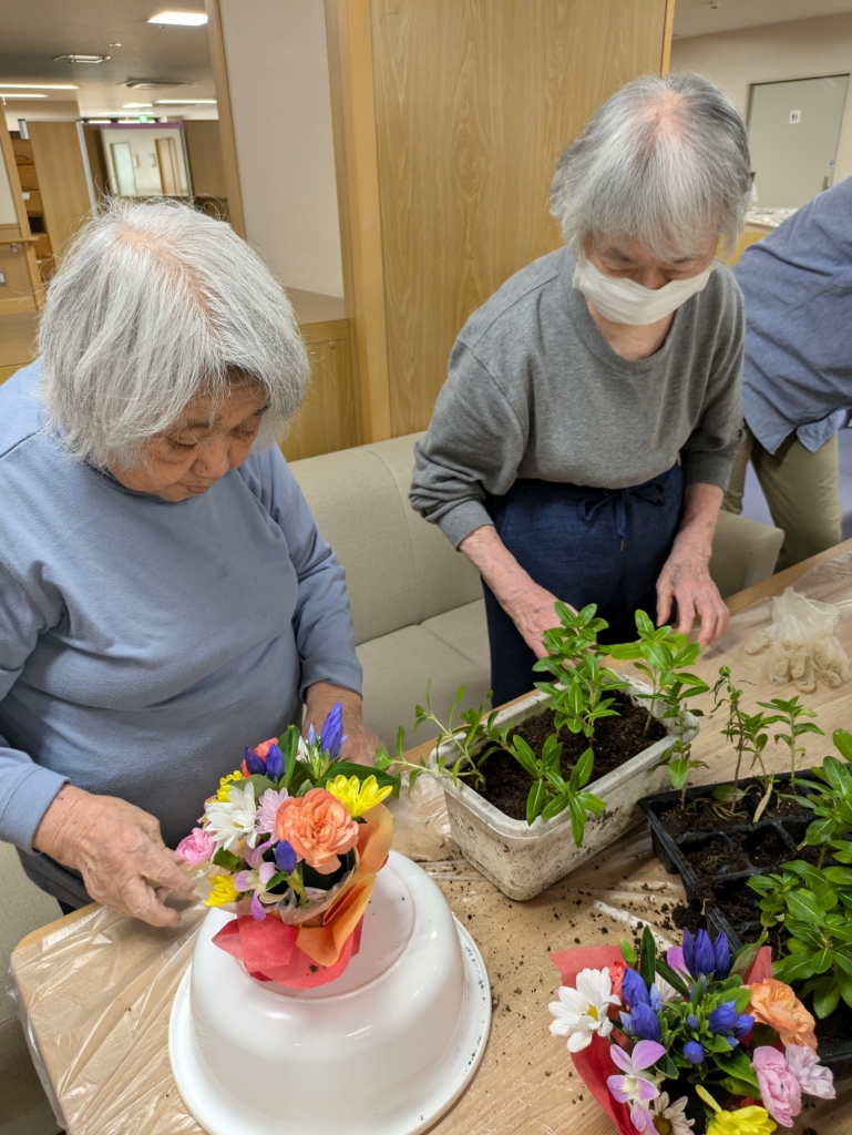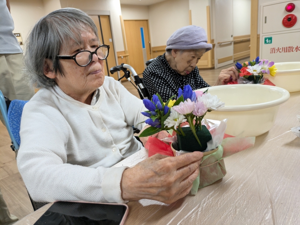 今回の園芸クラブでは、季節の花を使ったフラワーアレンジメントを行いました。リンドウ、蘭、菊など色とりどりのお花を思い思いに生け、世界に一つの作品が完成しました。