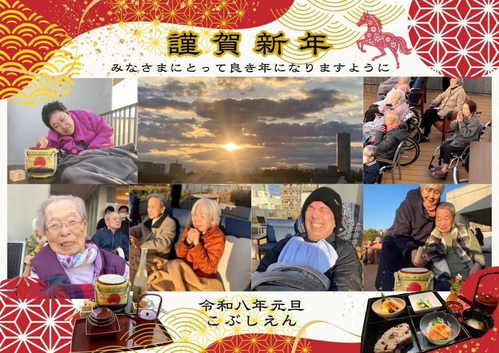 令和8年の幕開けを例年同様に、ご利用者と一緒に5階テラスで初日の出を拝みました。