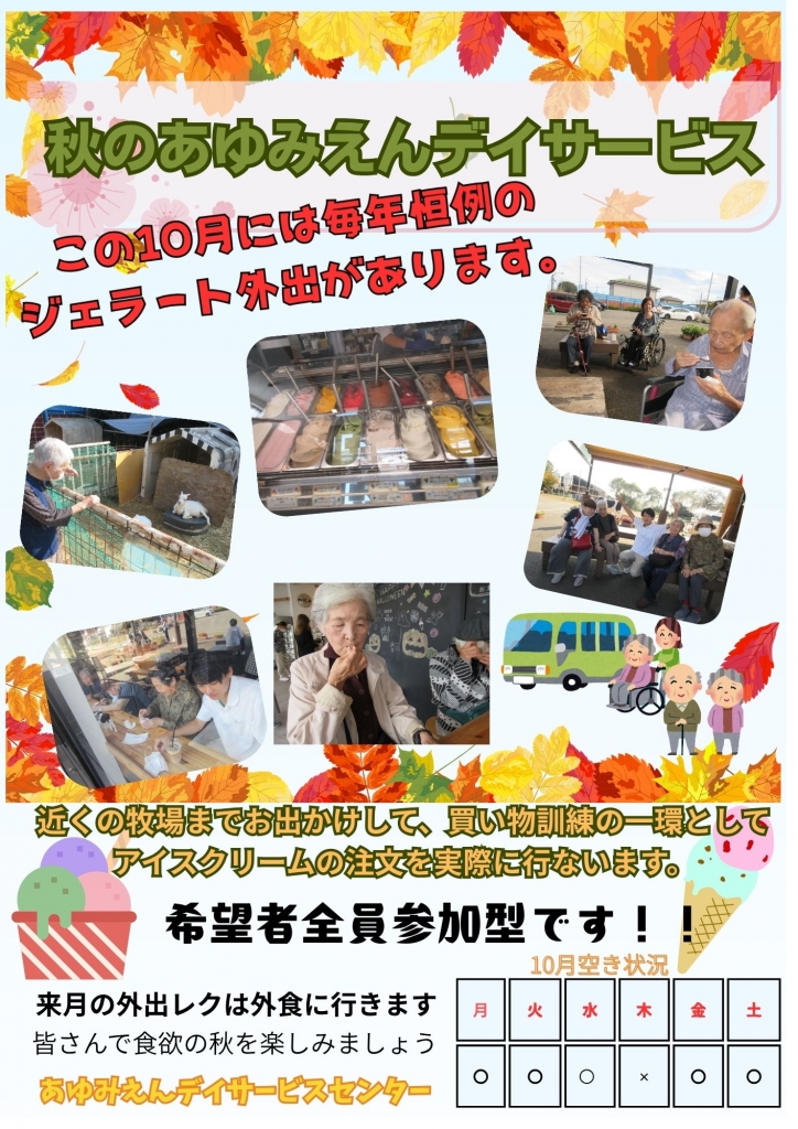 10月のあゆみえんデイサービスの活動を紹介します。10月には毎年恒例のジェラート外出を予定しています。希望される方は全員参加できますので、あゆみえんデイサービスのご利用をお待ちしています。